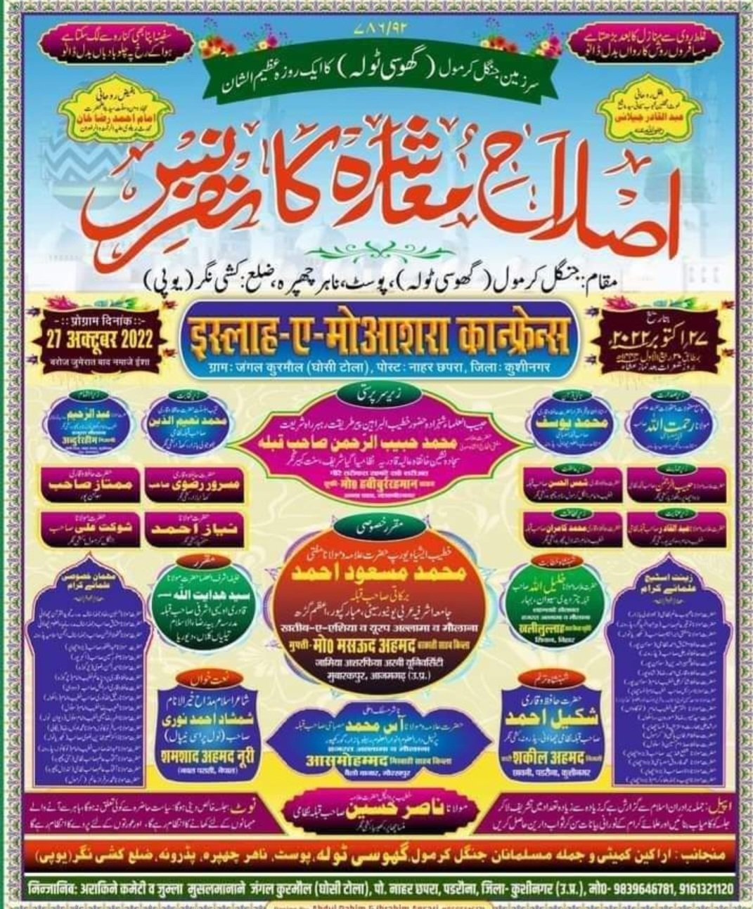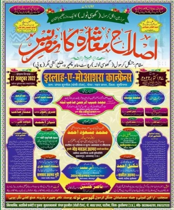 कुशीनगर:-यूपी के कुशीनगर जिले से बड़ी खबर आज 27 अक्टूबर दिन जुमेरात बाद नमाज़ ईशा सर जमीने जंगल कुरमौल घोसी टोला पोस्ट नाहर छपरा पडरौना कुशीनगर में इसलाह ए मोआशरा कान्फ्रेंस का इनकाद ज़ेरे सरपरस्ती पिरे तरीकत रह बरे राहे शरीयत हजरत अल्लामा मौलाना मोहम्मद हबीबुर्रहमान साहब किबला अगया शरीफ संत कबीर नगर जेरे सदारत हजरत अल्लामा मौलाना रहमतुल्लाह मिस्बाही साहब अंजुमन इस्लामिया पडरौना मुकरी रे खुसूसी हजरत अल्लामा मौलाना मोहम्मद मसउद अहमद मिस्बाही अल जामीअतुल अशरफिया मुबारकपुर आजमगढ़ खतिबे जीशान हजरत मौलाना खलिलुल्लाह चतुर्वेदी सिवान बिहार हजरत अल्लामा मौलाना सैयद हेदायतुल्लाह साहब किबला मोरवन रामकोला कुशीनगर खतिबे पूर्वांचल अल्लामा मौलाना नासिर हुसैन निजामी मनसा छापर पडरौना कुशीनगर नाशिरे मसलक ए आला हजरत अल्लामा मौलाना आस मोहम्मद मिस्बाही साहब किबला शायरे हिंदुस्तान हजरत कारी मोहम्मद शकील निजामी छावनी पडरौना कुशीनगर शहंशाह ए तरन्नुम शमशाद रजा नूरी नेपाल जेरे निजामत हजरत मौलाना नईमुद्दीन निजामी भुजौली बाजार जेरे निजामत मसरूर रजवी खड्डा कुशीनगर जेरे एहतमाम मौलाना अब्दुर्रहीम निज़ामी खतिबो इमाम जंगल कुरमौल जुम्ला बेरादराने इस्लाम से गुजारिश है जलसे में ज्यादा से ज्यादा तादाद में शिरकत फरमाएं ।