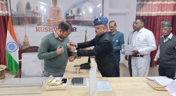 कुशीनगर। जनपद में सशस्त्र सेना झंडा दिवस के अवसर पर जिला सैनिक कल्याण एवं पुनर्वास अधिकारी तथा भूतपूर्व सैनिकों द्वारा जनपद स्तरीय अधिकारीगण व विभागाध्यक्षों को झंडा स्टीकर लगाकर सशस्त्र सेना झंडा दिवस मनाया गया। विदित हो कि राष्ट्र की सशस्त्र सेना और नागरिकों के बीच परस्पर आपसी स्नेह और सम्मान की भावना जागृत करते हुए युद्ध में शहीद भूतपूर्व सैनिक, उनके परिवार तथा सेवारत सैनिकों के कल्याण के प्रति नागरिकों से जुड़ाव व सहयोग प्राप्त करने के लिए सशस्त्र सेना झंडा दिवस का आयोजन 1949 से ही किया जाता रहा है।जिला सैनिक कल्याण एवं पुनर्वास अधिकारी विंग कमांडर आलोक सक्सेना ने बताया कि आज पूरे देश में और विदेशों के भारतीय दूतावासों में सशस्त्र सेना झंडा दिवस मनाया जा रहा है।जिला सैनिक कल्याण व पुनर्वास अधिकारी ने बताया कि रक्षा मंत्रालय तथा भारत सरकार व उत्तरप्रदेश सरकार के निर्देशन अनुसार सशस्त्र सेना झंडा दिवस मनाते हुए सैनिक कल्याण के लिए वर्ष 2022 हेतु धन संग्रह अभियान भी चलाया जा रहा है । विंग कमांडर ने बताया कि यद्यपि प्रतीक स्वरूप झंडा दिवस 07 दिसंबर 2022 को आयोजित है परंतु विभिन्न आयोजनों द्वारा पूरे वर्ष धन एकत्रीकरण किया जाएगा। पूरे देश में दिसंबर के महीने को राष्ट्रीय गौरव माह भी घोषित किया गया है। इस क्रम में आज जिला सैनिक कल्याण एवं पुनर्वास अधिकारी तथा भूतपूर्व सैनिकों द्वारा माननीय जनपद न्यायाधीश अशोक कुमार सिंह, जिलाधिकारी रमेश रंजन, पुलिस अधीक्षक धवल जायसवाल, मुख्य विकास अधिकारी गुंजन द्विवेदी, अपर जिलाधिकारी वि0 रा0 देवी दयाल वर्मा, मुख्य चिकित्सा अधिकारी सुरेश पटारिया, वरिष्ठ कोषाधिकारी प्रवीण कुमार, जिला सूचना अधिकारी कृष्ण कुमार, जिला प्रोबेशन अधिकारी विनय कुमार परियोजना निदेशक जगदीश त्रिपाठी एवं विभिन्न कार्यालय के कार्यालयाध्यक्षों व कर्मचारीगणों को झंडा स्टीकर लगाकर सशस्त्र सेना झंडा दिवस मनाया गया। इस अवसर पर अधिकारीगणों को स्मारिका भी प्रदत की गई।इस अवसर पर भूतपूर्व कैप्टन एल बी त्रिपाठी, कैप्टन शमसुद्दीन अंसारी व जिला सैनिक कल्याण व पुनर्वास कार्यालय से देवेन्द्रनाथ गुप्ता, प्रभाकर नाथ तिवारी, जवाहरलाल, राजेश गुप्ता आदि मौजूद रहे।