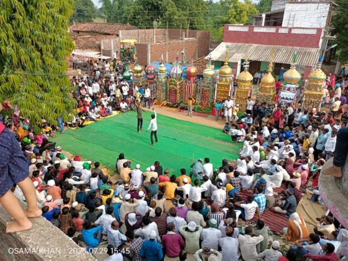 महराजगंज:-यूपी के महराजगंज जनपद के परतावल ब्लॉक अंतर्गत पूरे हर्षोल्लास के साथ मनाया गया मुहर्रम पर्व बताते चलें इस्लामिक कैलेंडर का यह पहला महीना है। और इस महीने के 10 तारीख को योमे याशूरा यानी मोहर्रम का पर्व मुस्लिम समुदाय बहुत ही अकीदत मंद के साथ मनाते है।कोटवा पिपरिया सहित इस जुलूस में 22 गांव के लोग शामिल होते हैं यह जुलूस ग्रामसभा पिपरिया से निकलकर कोटवा होते हुए परतावल चौक,छातीराम नहर पुल तथा परतावल बभनौली के पास एकत्रित होकर परतावल कस्बा के ताजिया से मिलन बहुत ही जोरदार तरीके से होते हुए कर्बला पर एकत्रित होता है।जुलूस के दौरान उद्योग व्यापार मंडल परतावल के अध्यक्ष बलराम गुप्ता ने जुलूस में शामिल लोगों के लिए शरबत का भरपूर व्यवस्था कराया था वही श्यामदेउरवा पुलिस ने भी काफी मुस्तैदी दिखाई।इस दौरान जुलूस में शामिल ताजियादारो में ताहिर सिद्दीकी, कोटवा ,शुक्रउल्लाह ,अकलू कनौजिया ,लाल मोहम्मद, नेबू लाल ,मुन्ना हाशमी ,दिलबहार, शहंशाह आलम,जावेद सिद्दीकी, मुस्ताक सहित हजारों की संख्या में लोग मौजूद रहे। साथ ही साथ मोहर्रमी जुलूस शांतिपूर्ण ढंग से संपन्न हुआ।