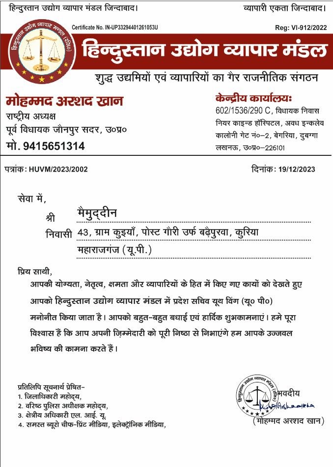 सिसवा ब्लॉक के अंतर्गत ग्रामसभा कुइया के रहने वाले मैनुद्दीन को हिंदुस्तान ब्यापार मंडल में बनाये गए प्रदेश सचिव मैनुद्दीन को एक नई ज़िम्मेदारी भी दी गयी। हिंदुस्तान उद्योग व्यापार मंडल का उद्दयेश भारतीय व्यापारिक समुदाय को वृद्धि, समृद्धि और ग्लोबल मंच पर मजबूती प्राप्त करना। यह संगठन उद्यमिता, नवाचार, तकनीकी उन्नति, औद्योगिक विपणन और वित्तीय प्रबंधन के माध्यम से व्यापारिक Almost को सशक्त बनाने का प्रयास करता है। हिंदुस्तान उधोग ब्यापार मंडल के पद अधिकारी के साथ साथ गांव वालों ने भी बहुत बहुत शुभकामनाएं दिया ।कुइया के रहने वाले मैनुद्दीन ने सबका शुक्रिया अदा करते हुए कहा कि अपने इस ज़िम्मेदारी को भलीभात निभायेंगे और सब को विश्वास दिलाता हूं कि अपनी ज़िम्मेदारी से नेक काम करने में कोई कसर नही छोड़ेंगे मैं सभी को विश्वास दिलाता हूं।